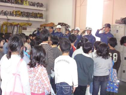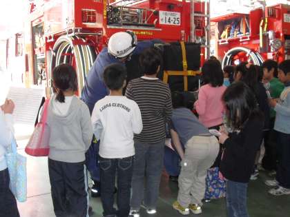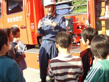 3年生は消防署見学に行ってきました。玉川消防署用賀出張所の消防士さん8名に、はしご車の説明や訓練の様子、消防署にある道具の説明などを聞いてきました。子どもたちは「これは何ですか?」などと、どんどん質問しながら真剣にメモをとっていました。最後に「困っている人を助けたいと思っている人は、ぜひ消防士になってください」とのお話がありました。消防署のみなさん、お忙しい中本当にありがとうございました。