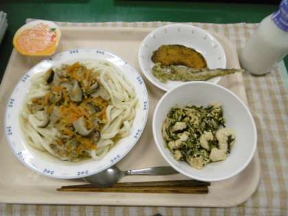 毎月19日は、食育の日です。今月は19日がお休みなので、今日の献立を食育の日の献立にしました。食育の日には、世界遺産である和食・伝統的な郷土料理を見直そうということで、いろいろな地域の郷土料理を出しています。そこでクイズです。今日の献立は、どこの郷土料理でしょうか?