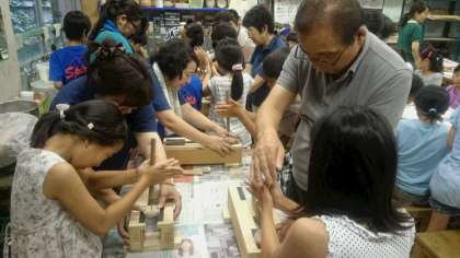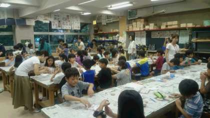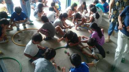 YCCのスタッフの方々にご指導いただき、こまにやすりをかけるところからスタートです。こまの中心を見つけてキリで穴を開け、ひごを通します。自分でよく回るポイントを見つけてボンドで固定。仕上げに好きな絵を描いてこまの完成です。全員でコマ回し選手権をして盛り上がりました。また、広告を活用して紙鉄砲を作って遊ぶこともできました。たくさんの保護者の方にもサポートをしていただきました。ご協力ありがとうございました。