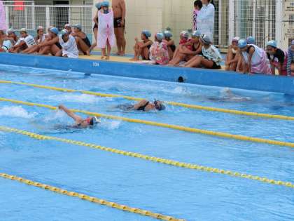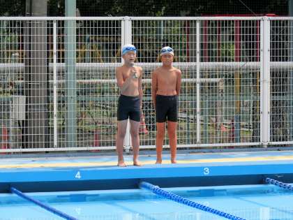6年生が水泳記録会を実施しました。一人一人がコースと名前を呼ばれ、レースが始まりました。