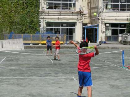 校庭では、テニスやティボール、バスケットボールをして、友達や先生、保護者の方と汗を流しました。