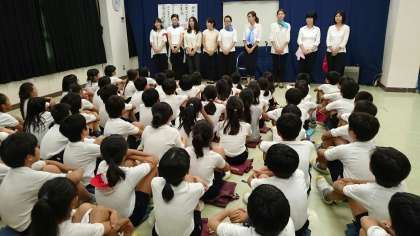 早口言葉やじゅげむ、OHPを使った物語など、とても楽しい読み聞かせをしてくださいました。じゅげむは1学期に国語の時間で学習していましたので、「じゅげむじゅげむ……」とみんなで声に出して読み、楽しんで聞くことができました。