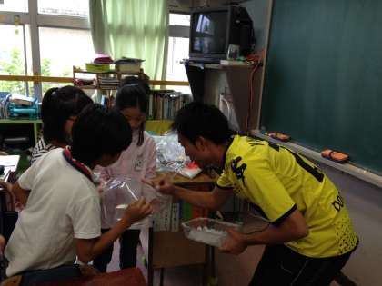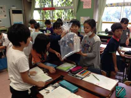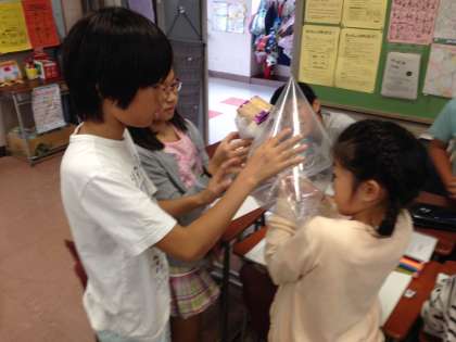 9月25日 4年(理科)〜水蒸気を集めて〜 公開日 2015/09/25 更新日 2015/09/25 学年 袋の中に空気を入れて、袋の外側から氷を当てました。すると、袋の中に水滴がつきます。水滴ができると、子どもたちは大喜びをしていました。 この実験を通して、空気中に水蒸気があることを理解しました。