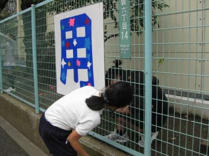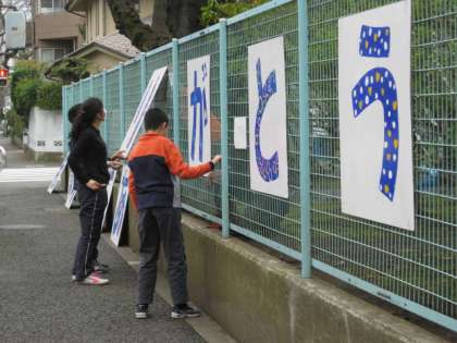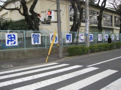 「用賀の町にありがとう 用賀小ありがとう 用賀小大すき」と書いてあります。もし学校の近くを通ったら是非見てください。