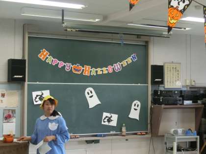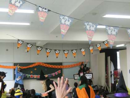 10月29日(木)英語活動 Fun Day(1) 公開日 2015/10/29 更新日 2015/10/29 英語活動 2学期のFundayは、英語活動支援員の皆様がご尽力いただき、ハロウィンパーティーをテーマにして行われました。 南校舎4階の視聴覚室は、普段とは違い、素敵な装飾で彩られていました。