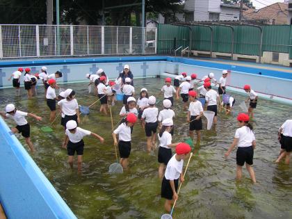 毎年、プール清掃の前に2年生の生活科で「やごとり」を行っています。