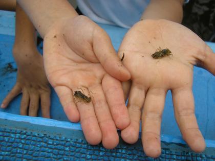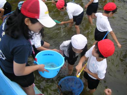 子どもたちは、プールの中で、「見つけた!」「10匹とったよ」と