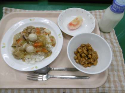 11月8日は、「いい歯の日」です。いい歯をつくるためには、よく噛んで食べることが大切です。8日は学校がお休みなので、今日の給食を、かみごたえのあるいかや大豆を使った、「いい歯の日」献立にしました。クイズです。一口、何回かむとよいと言われているでしょうか?