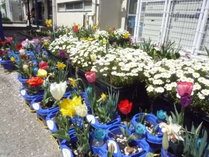 1用賀小学校は、新学期を迎えて春の花が咲き乱れています。入学式を迎えてくれた桜の花、正門の海棠の花、ノースポールにチューリップ、ラッパ水仙もとってもきれいに咲いています。黄色いジャスミンもびっくりするほどです。