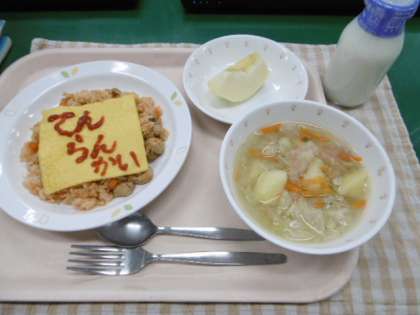 今日は、展覧会1日目です。そこで、給食でも展覧会気分を味わってもらいたいと思い、自分たちでケチャップを使って絵をかいて料理を完成させる、「セルフオムライス」にしました。楽しく飾って、おいしく食べましょう。