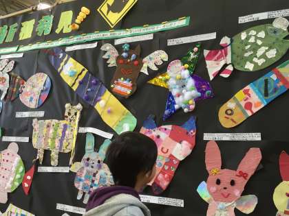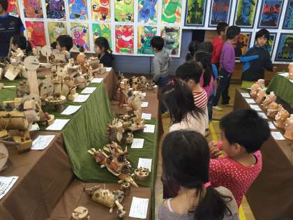 版画作品は、初めて彫刻刀に挑戦しました。明るい色と暗い色を重ねて刷られています。細かいところまで丁寧に彫っていて、さすが上級生、といった作品です。