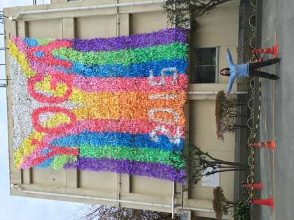子供からデザインを募集し、園芸ネットにスズランテープを細かく結び付けて絵にしました。何もなくても綺麗ですが、風になびく様もとても美しく、心を奪われます。1年担任の徳重先生と比べると、その大きさが一目瞭然ですね。