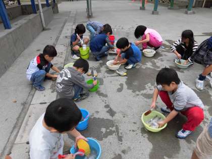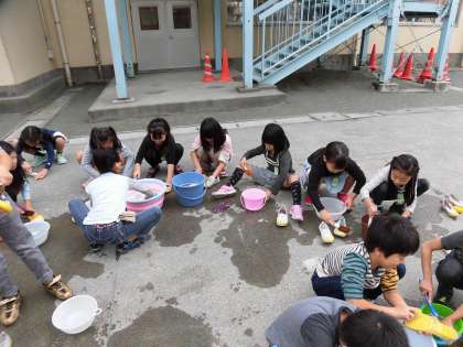 今日の5校時は「お手伝い大作戦」として、自分の上履きを自分で洗いました。昨日と比べて気温が低かったけれど、子ども達はやる気満々!洗ったことがある子も、初めての子も、綺麗に洗うことができました。