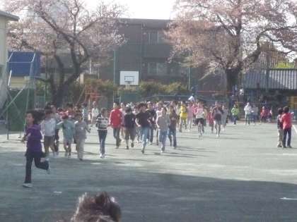春の青空の中で朝のマラソンが始まりました。6年生が中心ですが、よーく見てみると5年生4年生3年生、そして先生もまじっています。