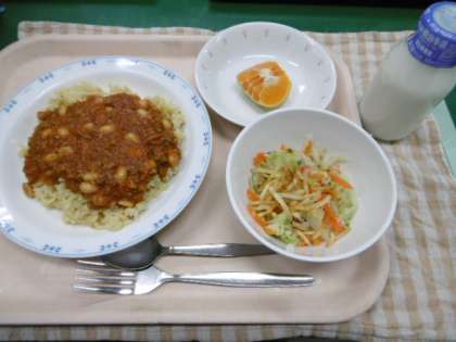 今日は、チリビーンズライスに使った「大豆」のクイズを出したいと思います。大豆は、たんぱく質がたくさん入っていることから、「畑の○○」と呼ばれています。さて、畑の何と呼ばれているでしょうか?