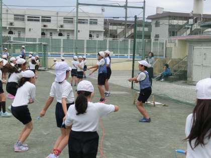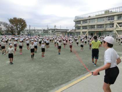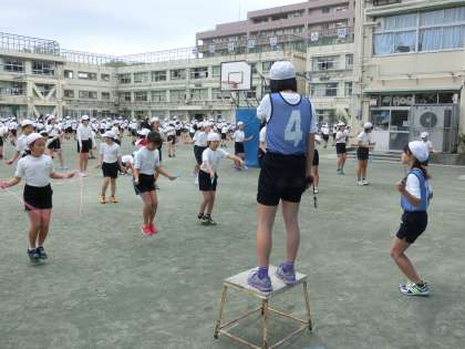 12月2日(水)体育朝会 短縄跳び 公開日 2015/12/02 更新日 2015/12/02 その他 体育朝会は1・2・3年生と4・5・6年生に分かれて短縄跳びを行いました。 4・5・6年生は、グループごとに運動委員の見本に見ながら、跳び方の練習をしました。運動委員会は、この日のために毎朝練習に励んでいました。これからも体育の時間や休み時間に練習して、いろいろな跳び方ができるようになりましょう。