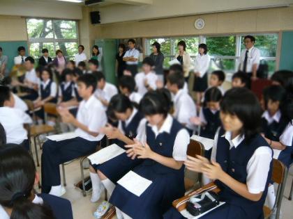 6月11日の6校時目 用賀中学校にて、用賀中・京西小・用賀小の3校合同(ようがの学び舎)の記念すべき第1回目の授業研究会を行いました。用賀中学校の1年生の「音楽」「国語」「理科」を用賀中の先生が授業し、「知」「徳」「体」の3つの分科会に分かれて授業を見た後、協議会を行いました。小学校の先生が補助者として授業に関与するのも初めてでしたが、この4月に小学校を卒業したばかりの子どもたちが生き生きと学習していたことが何よりも印象的でした。