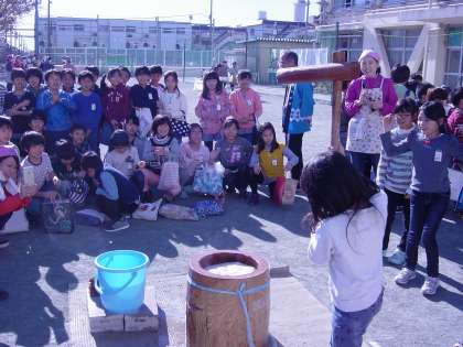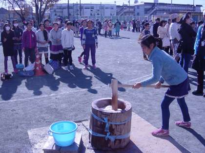 もちつき2 公開日 2015/12/07 更新日 2015/12/07 今日のできごと 子どもたち一人一人が実際にきねにさわり、ぺったん!ぺったん!ついていきました。周りの子どもたちもや先生方、保護者や地域の方々の温かい声援が、響き渡りました。