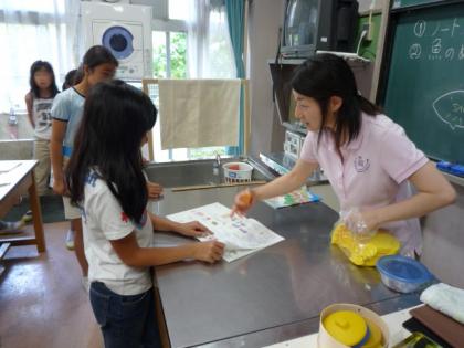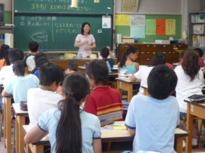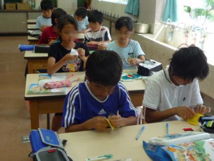 5年生の家庭科の授業をを訪問しました。魚の形のフェルトに名前と模様を縫い取ります。黄色いフェルトですから、模様を縫うのには白ばかりではなく、目立つ糸を選びます。みんな真剣ですが、子どもたちにとっては、けっこう難しそうでした。