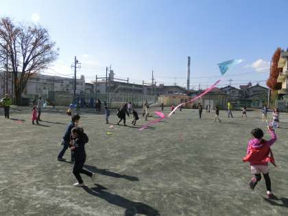用賀小学校の校庭に、色とりどりの凧が舞い上がりました。