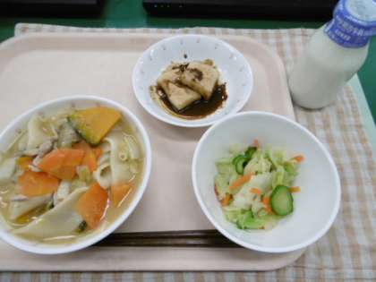 毎月19日は、食育の日です。今月は、19日がお休みなので、今日の給食を食育の日の献立にしました。食育の日には、「世界遺産である和食・伝統的な郷土料理を見直そう」ということで、いろいろな地域の郷土料理を出しています。そこでクイズです。今日の献立は、どこの郷土料理でしょうか?
