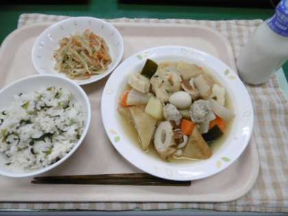 給食のおでんには、つみれやじゃがいも、だいこんなど、たくさんの食材が入っていて、栄養満点です。残さず食べましょう。