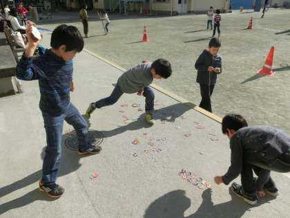 校庭では、竹馬に、めんこ、ベーゴマに、こま、竹とんぼ、そして羽子板遊びと、様々な遊びに夢中になりました。