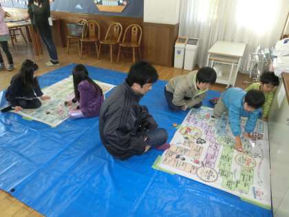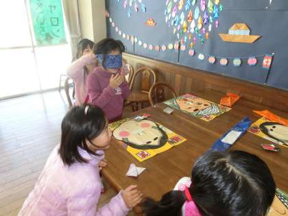 ランチルームでは、毎月開催されている「つきいちサロン」での折り紙とともに、「福笑い」や「用賀小すごろく」も用意されていて、友だちや地域の方、そして保護者の方と一緒に楽しみました。