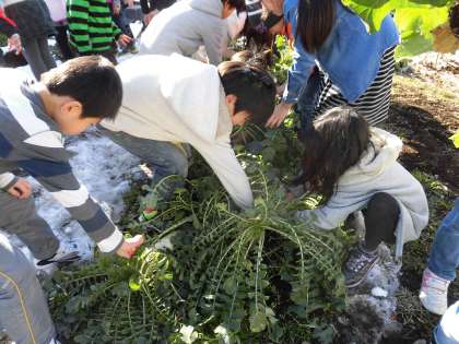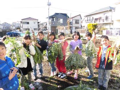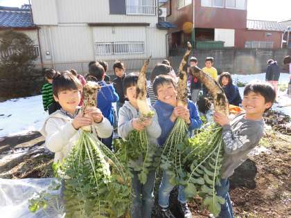 2年生は、生活科の授業で10月に小松菜・チンゲン菜・カブ・大根の種を畑に蒔きました。何度も間引きをしたり、雑草を取ったりしてお世話をしてきました。大根以外の野菜は、2学期にできあがり、家に持って帰り、おいしく食べました。いよいよ、今日は残った大根の収穫です。みんなで土の中に長く伸びた大根を一生懸命に抜きました。「よいしょ、よいしょ!」泥だらけになった手には、みんなで育てた大根が!!新鮮でおいしいとは思いますが、必ず火を通してから食べてください。今日、収穫していないクラスは、来週中に持って帰ります。