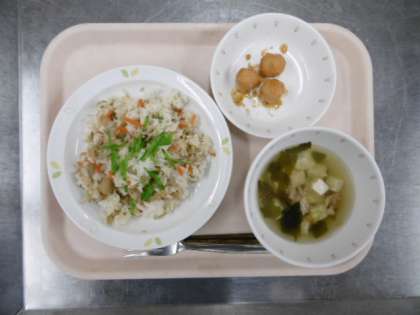 今日の給食には、じゃこ、とうふ、わかめ、みそを使った、カルシウムたっぷりメニューにしました。カルシウムは骨や歯を丈夫にしてくれます。残さず食べてくれるとうれしいです。