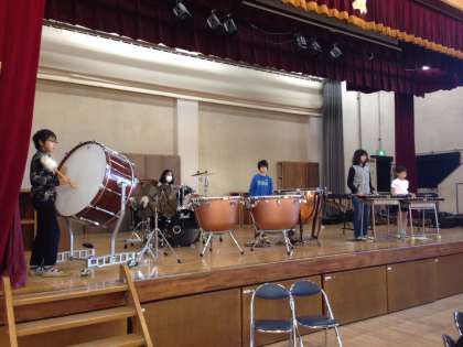 今日は早くから5年生を中心に楽器や椅子のセッティングをし、体育館を何周か走るという活動から始まりました。寒い体育館の中で、冷え切った楽器を鳴らすことはとても難しいことです。なので、体力づくりも兼ねて、まずは演奏者の体を温めたることから始めます。