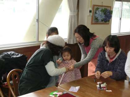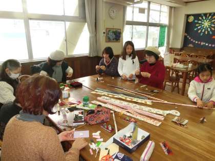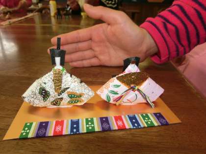 今日は、折り紙で雛人形を作りました。細かい作業も地域の方々に教えていただき、素敵な雛人形を完成することができました。