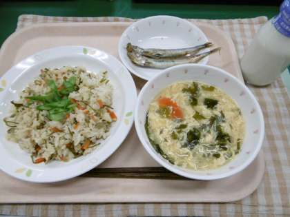 2/29 本日の給食 公開日 2016/02/29 更新日 2016/02/29 給食 〜今日の献立〜 鶏ごぼうごはん 牛乳 焼きししゃも かきたま汁 〜給食メモ〜 今日は、かきたま汁に使った「たまご」のクイズを出したいと思います。たまごにたくさん入っている「体をつくる」はたらきをする栄養素は、次のうちのどれでしょうか? 1.たんぱく質 2.食物繊維 3.ビタミンC ※クイズのこたえは、「食材がとれたところ…」の最後にのせています。 食材がとれたところ・・・ 閉じる 米…埼玉県 鶏肉…宮崎県 鶏卵…青森県 ししゃも…ノルウェー ごぼう…青森県 にんじん…千葉県 さやいんげん…沖縄県 だいこん…神奈川県 えのきたけ…新潟県 長ねぎ…千葉県 クイズのこたえは、1の「たんぱく質」です。たまごは栄養いっぱいの食べもので、たくさんの栄養素がバランスよく入っています。しかし、食物繊維やビタミンCはあまり入っていないので、食物繊維やビタミンCがたくさん入っている野菜なども一緒に食べましょう。