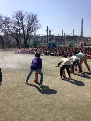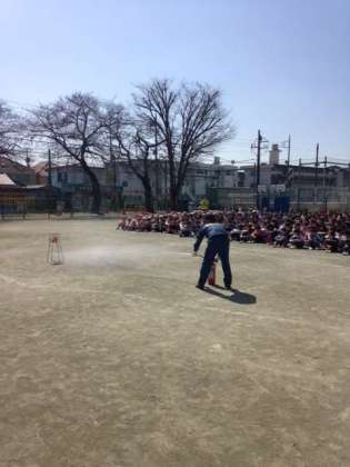 また今日は、玉川消防署用賀出張所の方々に来ていただき、6年生の代表児童による消火器操作訓練を行いました。訓練用の消火器(中身は水です。)を使っていざという時に備えました。