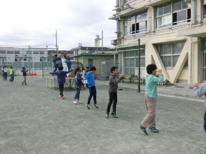 校庭で、本年度最後の集会を行いました。集会委員が考えた6年生を賞賛するダンスに合わせて、発表された文字数に合った人数になり、自己紹介をするゲームをしました。