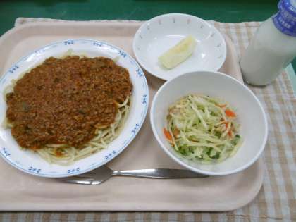 今日は、「スパゲッティミートソース」のクイズを出したいと思います。給食のミートソースには、何種類の野菜が入っているでしょうか?