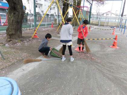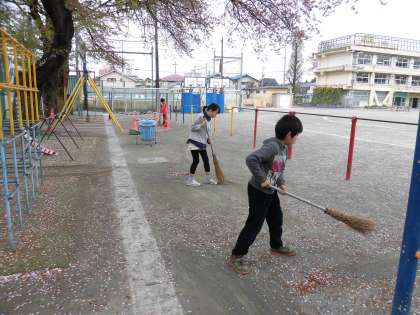 桜満開だった入学式も終わり、葉桜が綺麗な頃合いになってきました。その分花弁が舞い落ちているということで、整美委員会として校庭の桜の花びらを掃く活動を行っています。初日の今日は、朝早い集合にも関わらず、当番の児童がしっかり集まり、意識の高さを見せてくれました。「主事さんの仕事を少しでも楽にできたら」「遊具で遊ぶ児童が滑って転ばないように」そんな気持ちを持ちながら、これからも活動していきます。