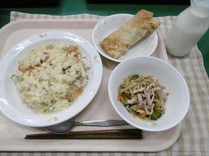 4/21 本日の給食 公開日 2016/04/21 更新日 2016/04/21 給食 〜今日の献立〜 あんかけチャーハン 牛乳 春巻き 中華サラダ 〜給食メモ〜 今日は、「春巻き」のクイズを出したいと思います。春巻きの名前の由来は、次のうちのどれでしょうか? 1.春という名前の人が考えた料理だから。 2.具に、春雨を使っていたから。 3.具に、春の野菜を使っていたから。 ※クイズのこたえは、「食材がとれたところ…」の最後にのせています。 食材がとれたところ・・・ 閉じる 米…埼玉県 豚肉…静岡県 鶏肉…岩手県 えび…インド しょうが…高知県 にんじん…徳島県 長ねぎ…千葉県 赤ピーマン…愛知県 ピーマン…茨城県 万能ねぎ…福岡県 にんにく…青森県 キャベツ…愛知県 もやし…栃木県 きゅうり…埼玉県 クイズのこたえは、3の「具に、春の野菜を使っていたから。」です。もともと春巻きの具には、立春のころに新芽が出る春野菜を使っていたそうです。今日の給食の春巻きにも、春野菜のたけのこやキャベツを使っています。