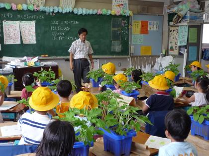 生活科の学習で朝顔を観察しています。詳しく観察するために教室に鉢を持ってきての学習です。もう本葉が10枚以上出ています。