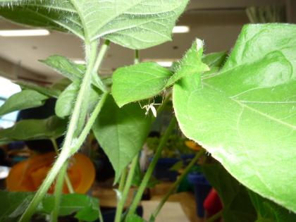 「あっ!本葉のかげにカマキリの赤ちゃんがいます。」
