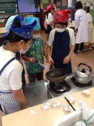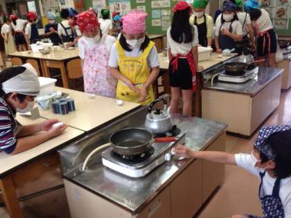 5年 家庭科1 公開日 2016/05/07 更新日 2016/05/07 学年 家庭科の授業で初めての調理実習に取り組みました。調理器具の名前や火の取り扱い方について説明を受けたあと、積極的に実習に取り掛かりました。