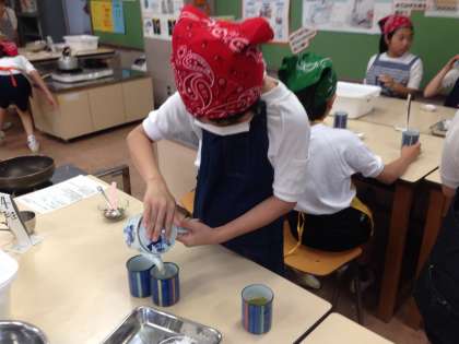 お湯を沸かしてお茶をいれました。濃すぎず薄すぎず、おいしいお茶が完成しました。べっこう飴は少し焦げてしまった子もいましたが、おいしくいただくことができました。片付けも協力して行うことができました。