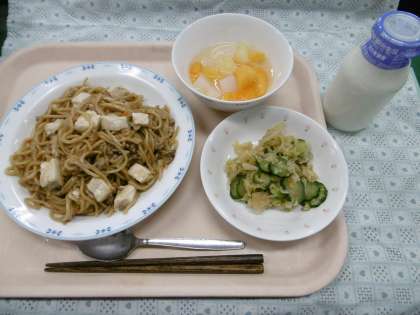 麻婆豆腐焼きそばに使っている豆腐には、体をつくってくれるたんぱく質や、骨や歯を丈夫にしてくれるカルシウムがたくさん入っています。残さず食べましょう。