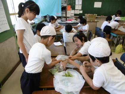 今日は、今が旬のグリンピースを使って、「グリンピースごはん」を炊きました。そこで今日は、「グリンピース」のクイズを出したいと思います。グリンピースにたくさん入っている、おなかの中をきれいにそうじしてくれる栄養素は、次(つぎ)のうちのどれでしょうか?