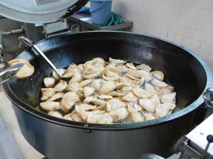 給食のジャンボぎょうざは、調理員さんが1つ1つ包んで、油で揚げて作ってくれています。今日も、残さず食べましょう。