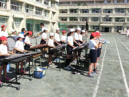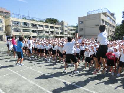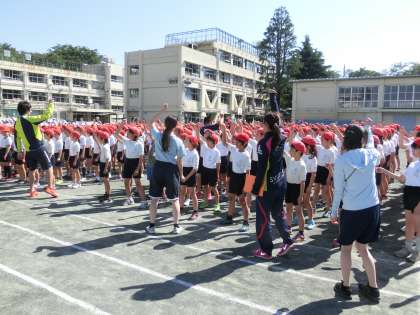 澄み切った青空のもと、用賀小学校の校庭に「運動会のうた」が響き渡りました。教員も一緒になって、大きな歌声を用賀の町まで轟かせました。