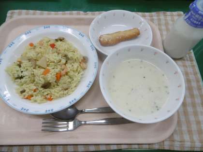 毎月19日は、食育の日です。食育の日には、「給食で世界を飛び回ろう!〜東京オリンピックに向けて、世界各国の料理に触れよう〜」ということで、いろいろな国の料理を出しています。そこでクイズです。今日の献立は、どこの国の料理でしょうか?