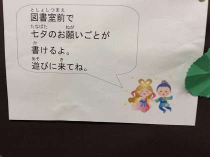 7月9日(土)七夕飾り ブックアシスト(1) 公開日 2016/07/09 更新日 2016/07/09 特色ある活動・取り組み 今日は七夕でした。今年は嬉しいことに快晴でした!織姫様と彦星様はきっと会えたことでしょう。 七夕集会では子どもたちはクラスごとに願い事を元気に発表していました。願うといいなと思います。 また、ブックアシストさんが図書室と職員室前に素敵な飾りつけをしてくださいました。ありがとうございます!