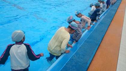 その後は「けのび」「バタ足」「クロール」「平泳ぎ」と、いつもと同じ水慣れをすることで、水着との違いを肌で感じることができ、