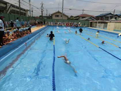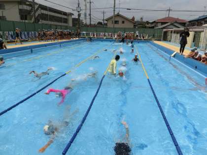 先週は天候のため水泳指導ができなかったので、本日が夏季水泳指導の初日となりました。あいにくの曇り空でしたが、いざプールに入るとキラキラした笑顔で楽しそうにしていました。